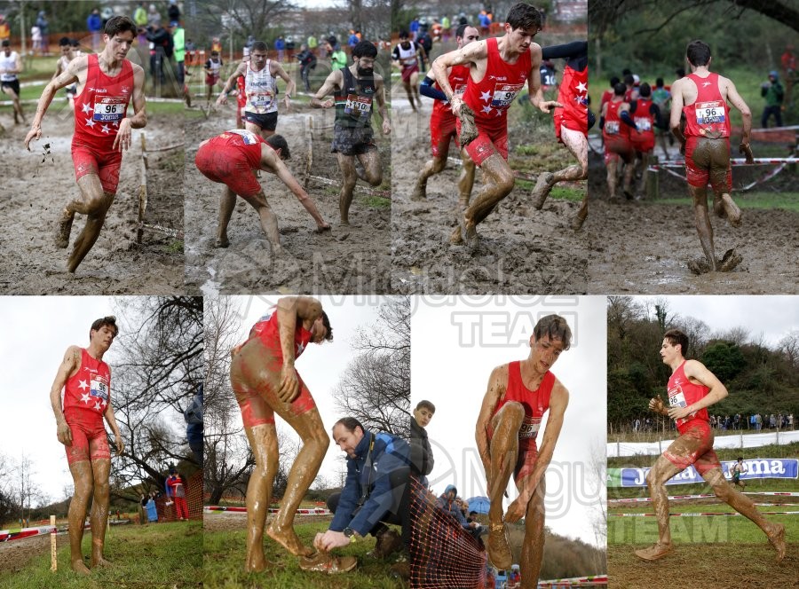 CV Campeonato de España de Campo a Traves Individual y Federaciones, Circuito de Las Balsas (Ortuella) 29-01-2023. Carrera Absoluta / Senior hombres; Pablo QUIJADA de la Comunidad autónoma de Madrid. Pierde las zapatillas en el barro y los espectadores le desabrochan los cordones y ayudan a ponerselas, ya que el no puede por tener los dedos entumecidos de frio. Se le puede ver también una herida en la espinilla de su pierna derecha, producida por los clavos de otro corredor. Finalmente termina la carrera, en un gesto que le engrandece como atleta. lustracion perdida de zapatilla.