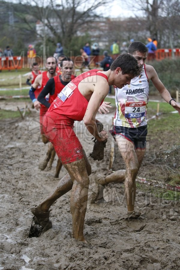 CV Campeonato de España de Campo a Traves Individual y Federaciones, Circuito de Las Balsas (Ortuella) 29-01-2023. Foto 4 de 27. Carrera Absoluta / Senior hombres; Pablo QUIJADA de la Comunidad autónoma de Madrid. Pierde las zapatillas en el barro y los espectadores le desabrochan los cordones y ayudan a ponerselas, ya que el no puede por tener los dedos entumecidos de frio. Se le puede ver también una herida en la espinilla de su pierna derecha, producida por los clavos de otro corredor. Finalmente termina la carrera, en un gesto que le engrandece como atleta. lustracion perdida de zapatilla.