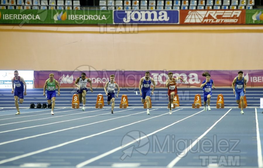 Mediterranean U23 Indoor Championships, velodromo Luis Puig (Valencia) 22-01-2023. 60 metros hombres; Ilustracion salida.