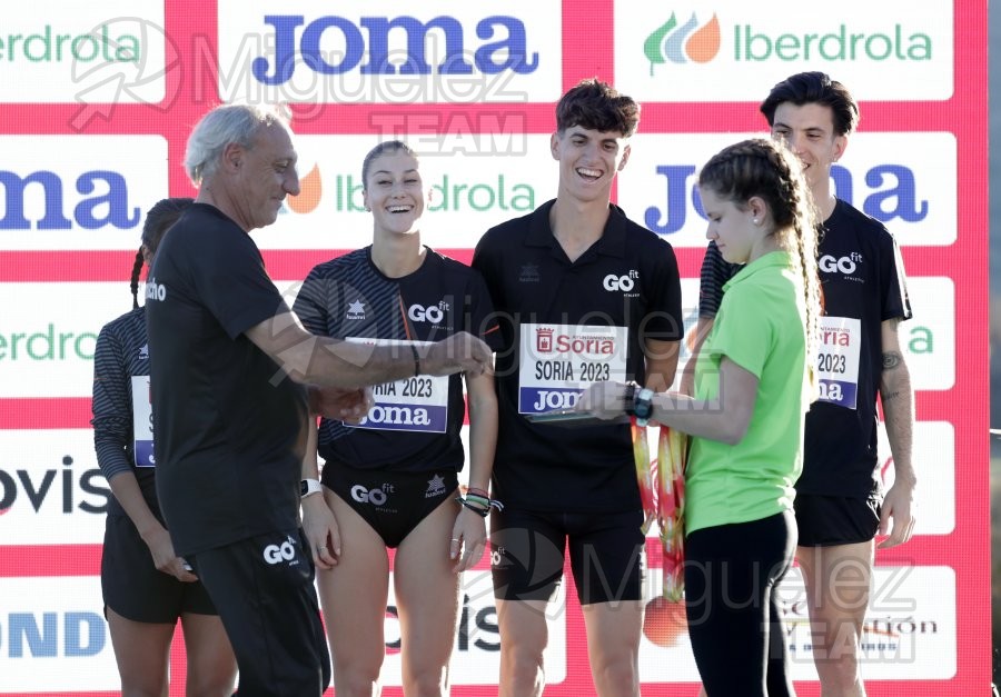 ATLETISMO: Campeonato de España Clubes Campo a Traves / cross, Monte Valonsadero (Soria) 19-11-2023. Relevos 4x1 Vuelta Mixto. Go Fit Athletics 3º. Entrega las medallas Fermin CACHO, ex atleta de 1500 metros.